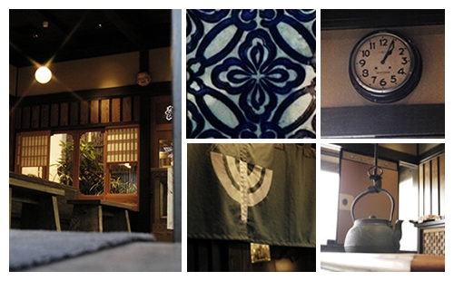 欅の梁を中心に、囲炉裏、畳、坪庭、水鉢、石の床、行灯等