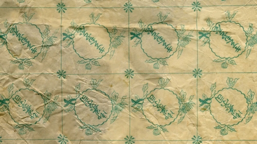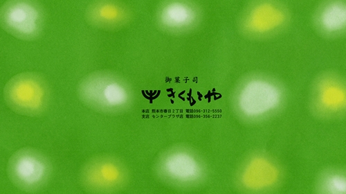 (昭和40年頃〜50年) マークの登録商標(菊の花と「きくもとや」の『キ』の文字を表した村上健一によるデザイン)が取れたのを記念して熊本のデザイナー友枝翁太郎氏に依頼したデザインの包装紙です。当時は良い評価をいただいていた包装紙でした。 | ||